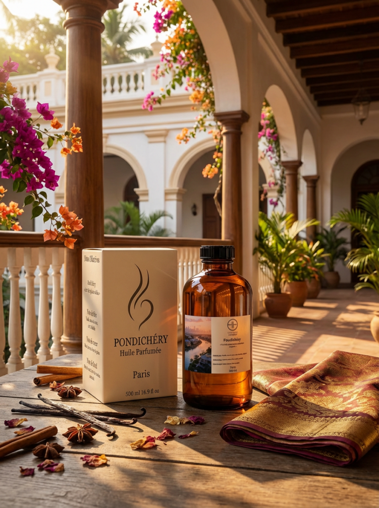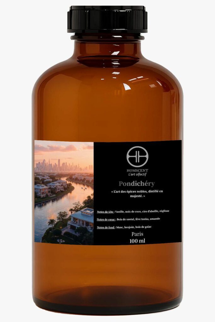 Plongez dans l’univers envoûtant de Pondichéry, une fragrance d’inspiration exotique qui s’ouvre sur un accord riche et réconfortant de vanille, noix de coco, cire d’abeille et réglisse. Son cœur de bois de santal, fève tonka et amandes dévoile une chaleur douce et raffinée, aux accents délicatement gourmands. Le parfum s’ancre enfin dans un fond musqué, benjoin et bois de gaïac, offrant un sillage boisé, enveloppant et profondément élégant.